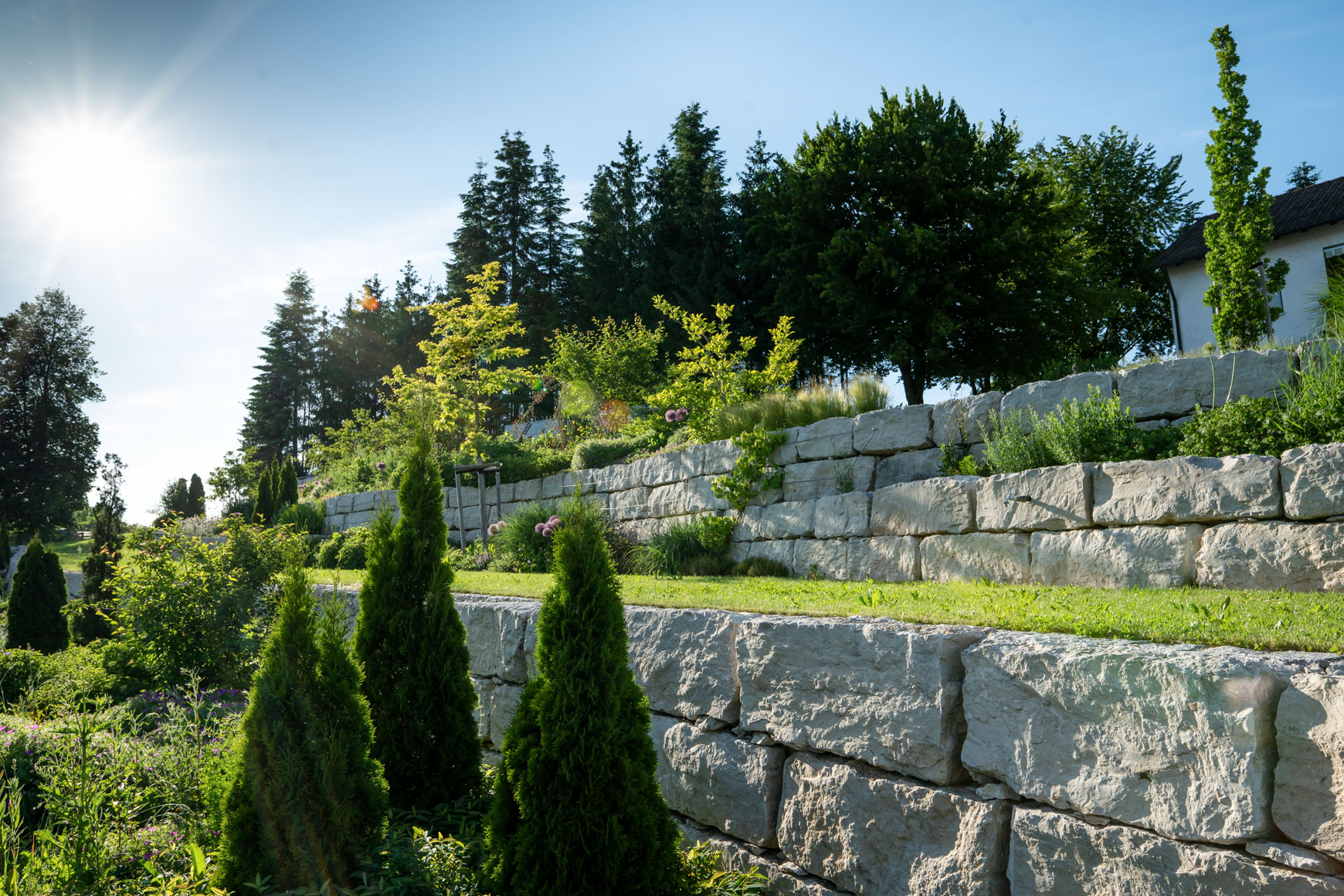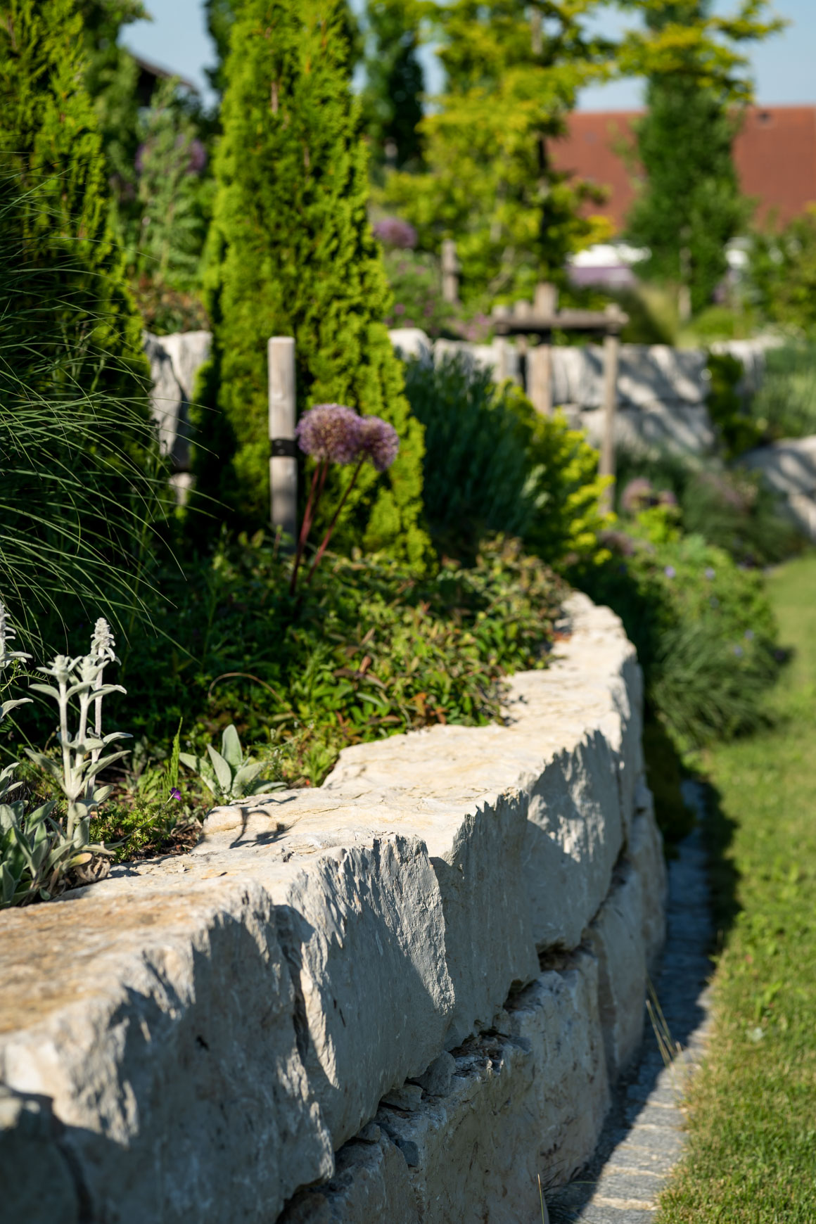 Materialien: Natursteinmauern aus Jura, Bepflanzung mit verschiedenen Gehölzen und pflegeleichten Stauden