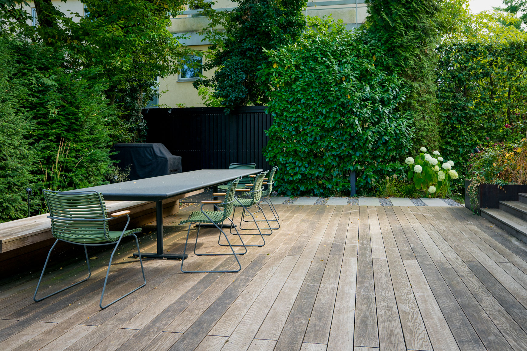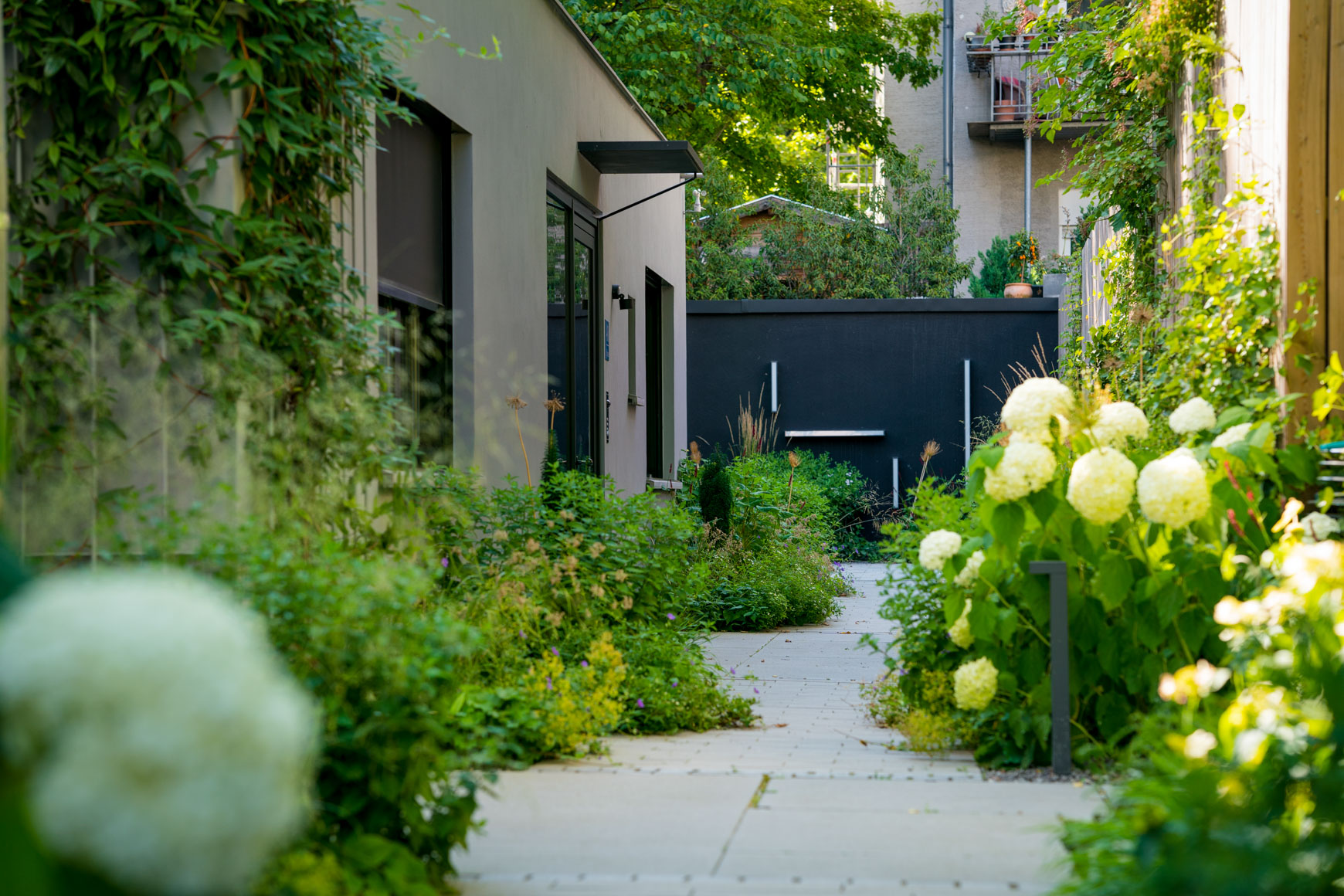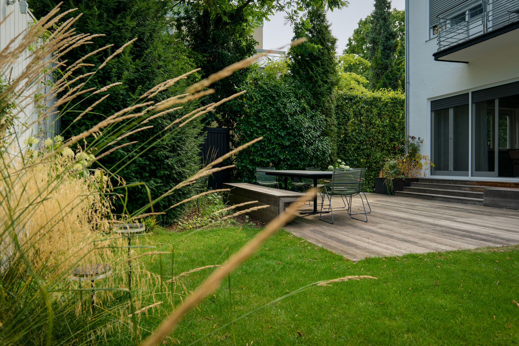 Grüne Oase Im Herzen der Stadt Ort: München Materialien: Großformatplatten Beton, Rigelpflaster Beton, Sichtschutzwände aus Holz