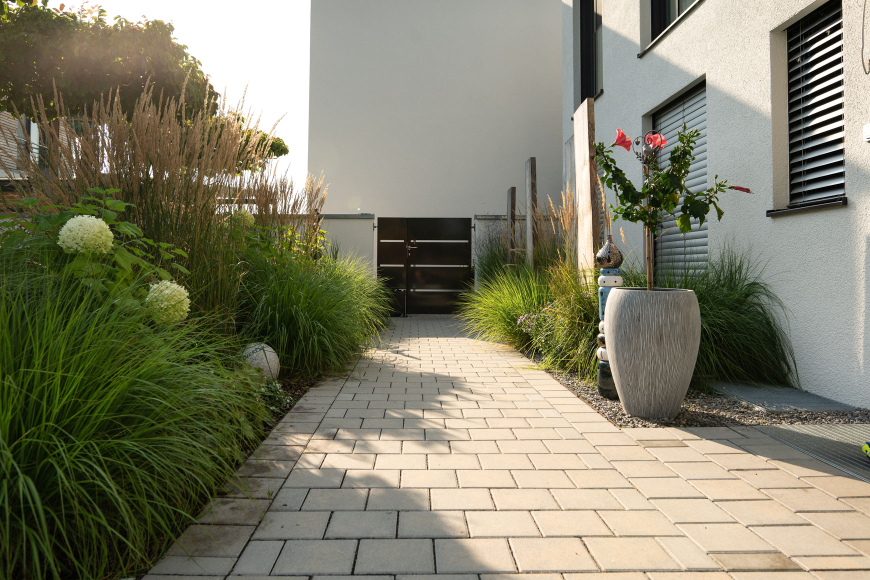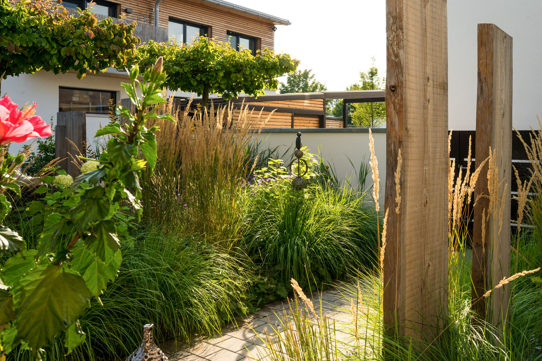 Materalien: Natursteinplatten, Betonpflaster, Holzterrasse, lockere Gräserpflanzung, Sichtschutz aus Baumstammbrettern