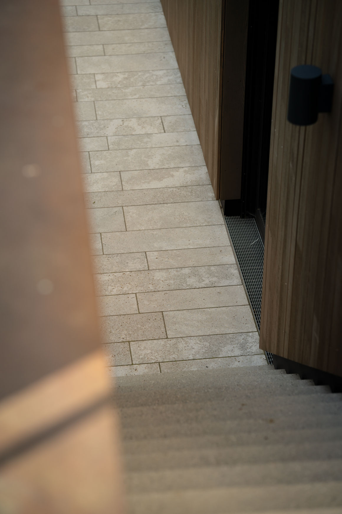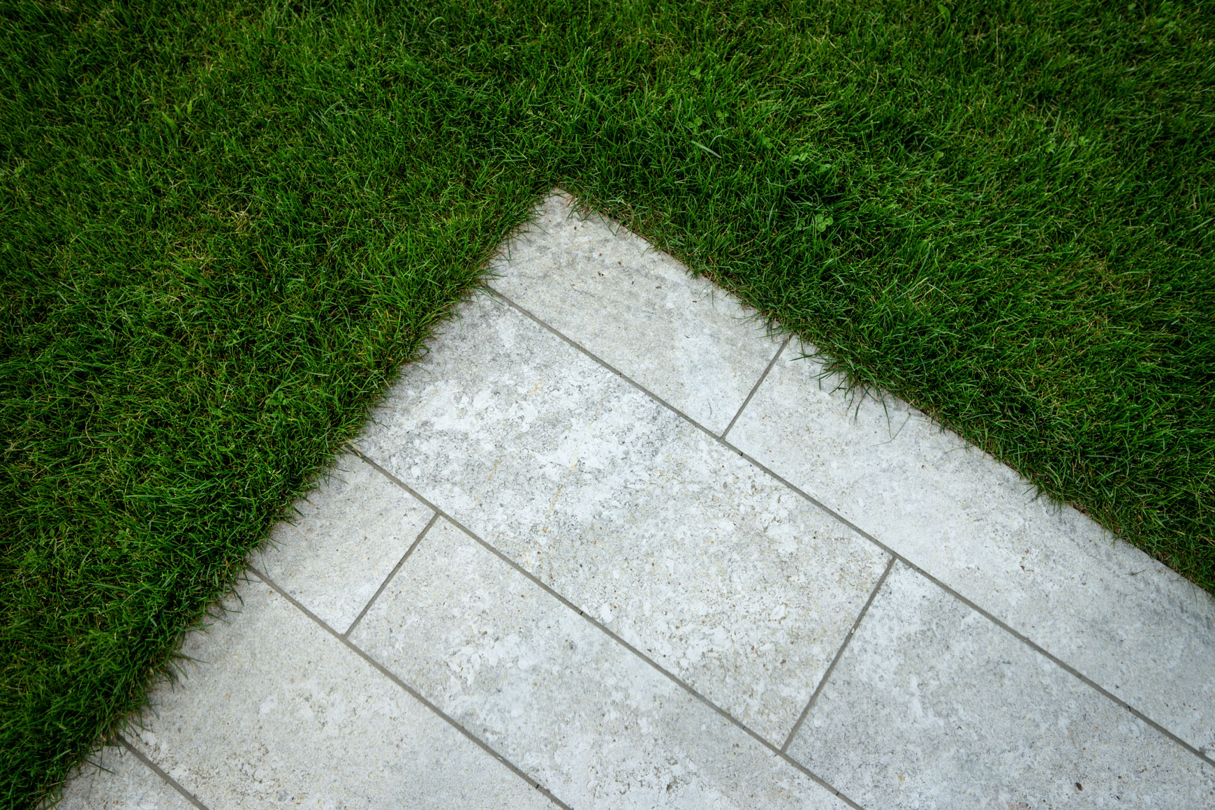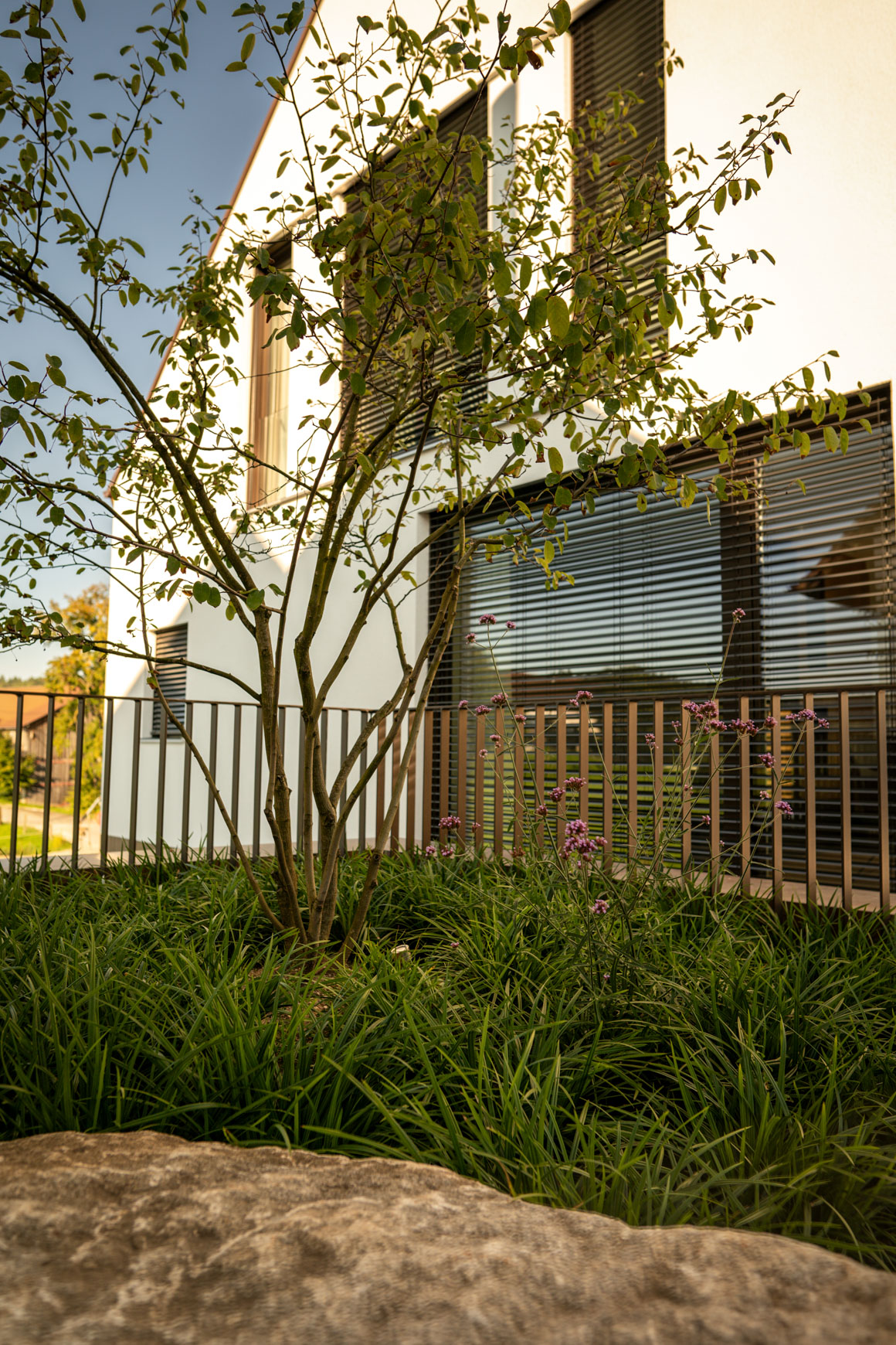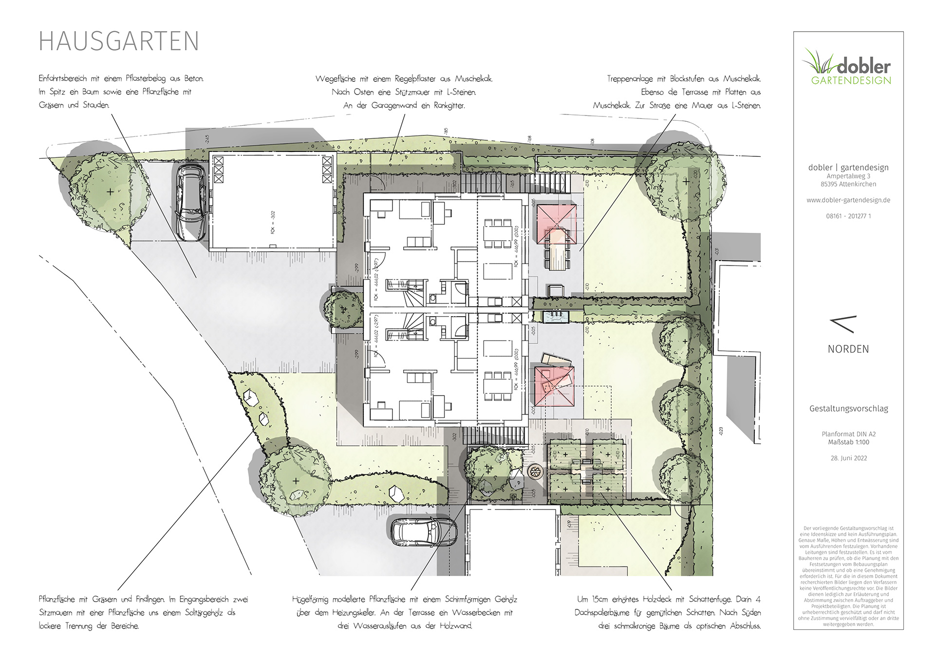 Materialien: Groß- und kleinformatige Natursteinplatten, Holzdeck, Sitzbereich wird von Bäumen überdacht