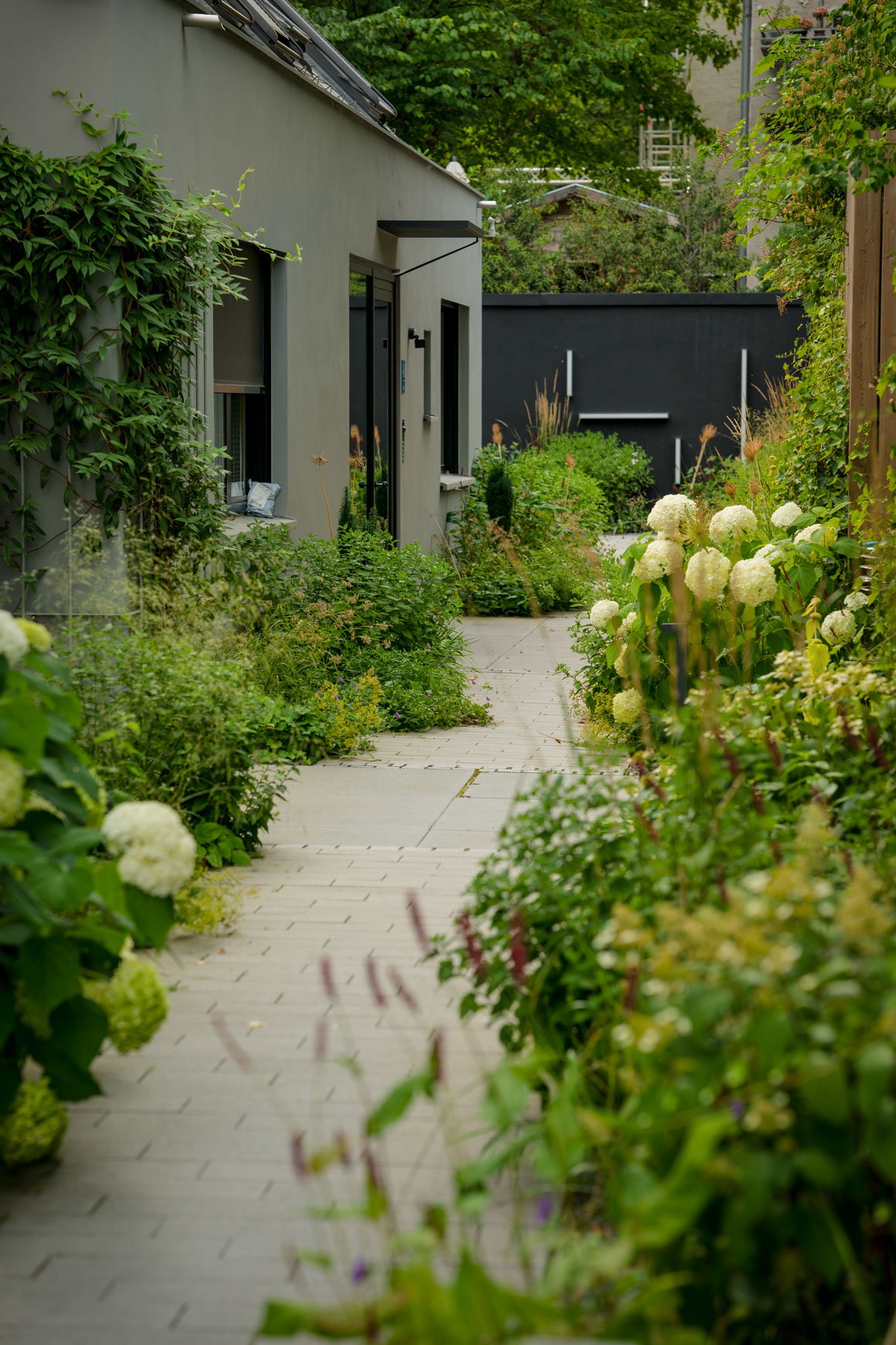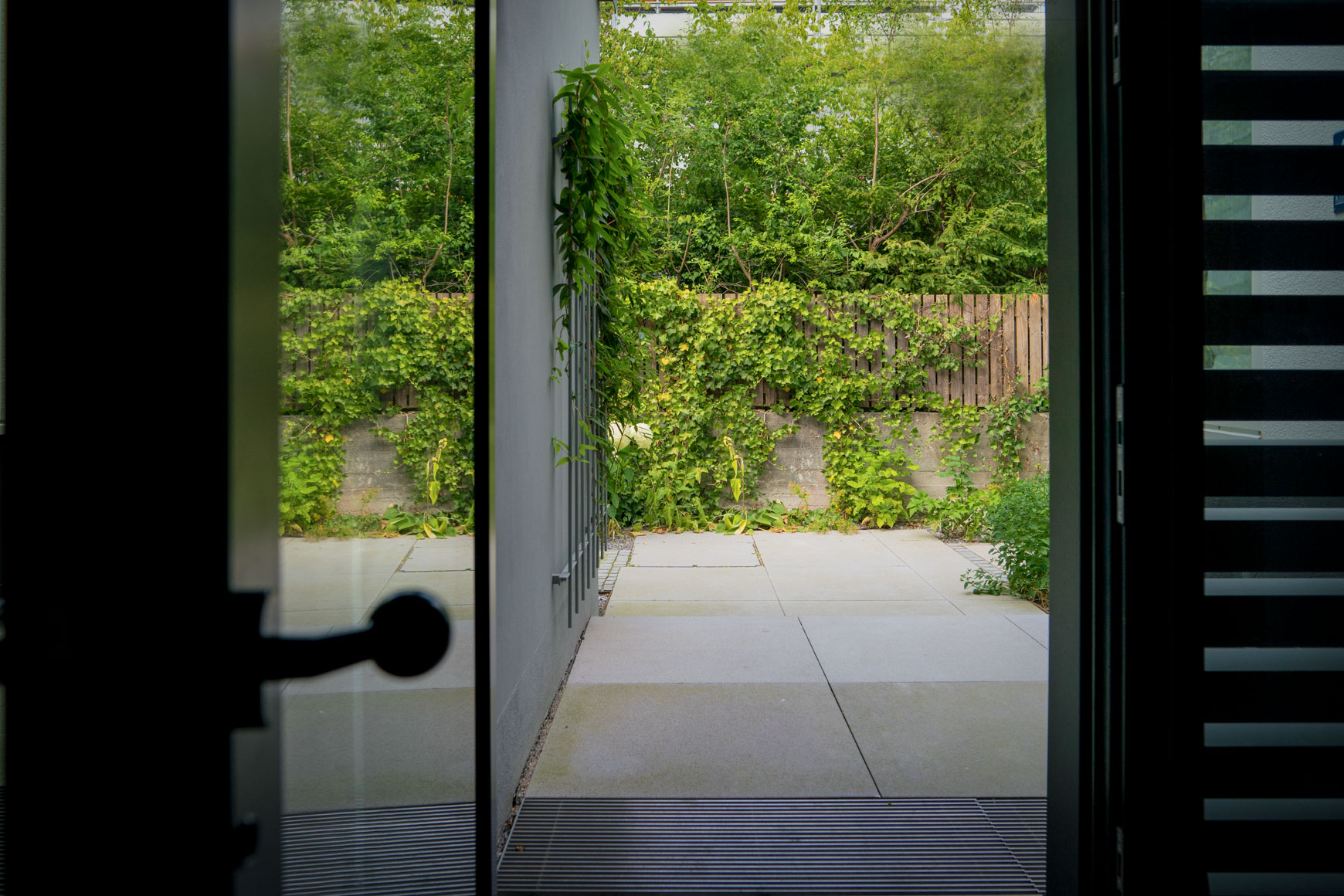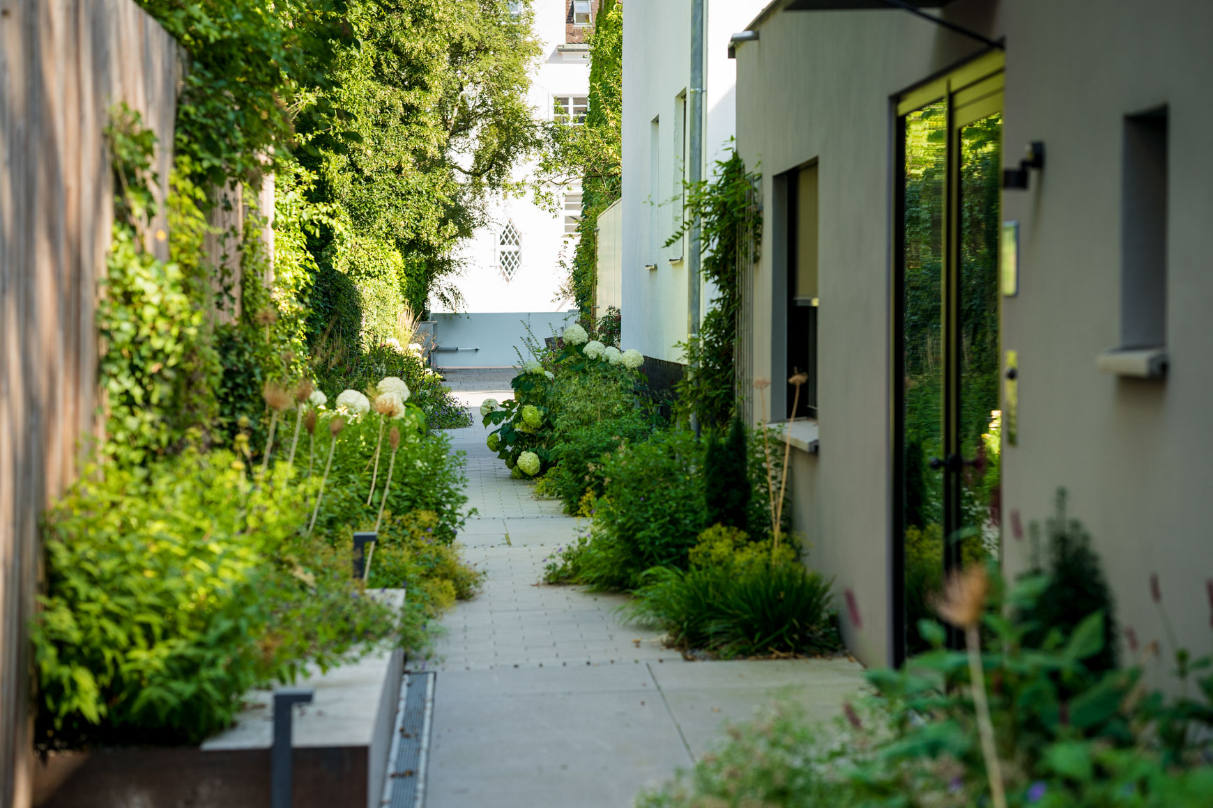 Grüne Oase Im Herzen der Stadt Ort: München Materialien: Großformatplatten Beton, Rigelpflaster Beton, Sichtschutzwände aus Holz