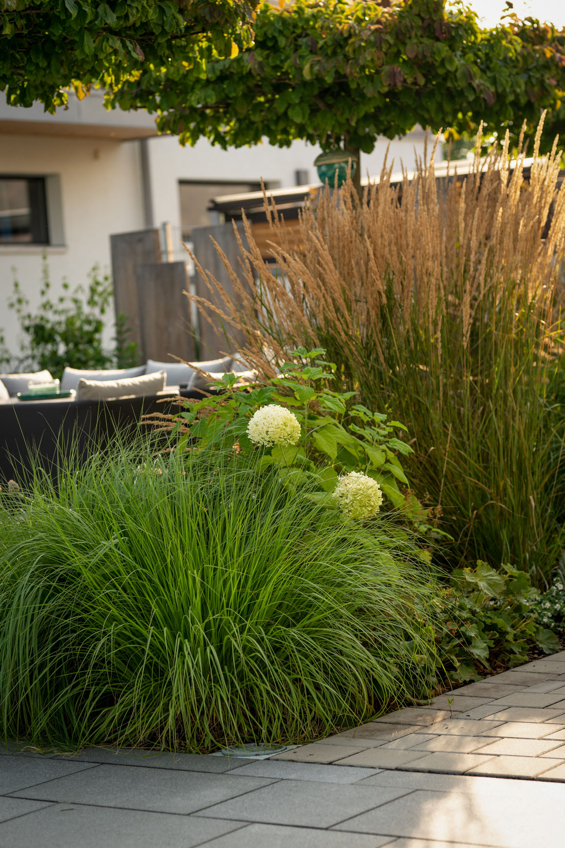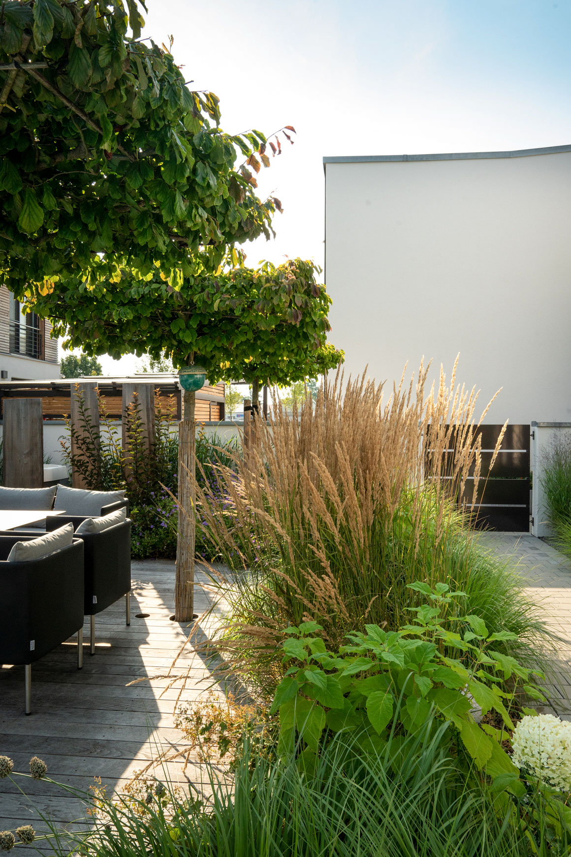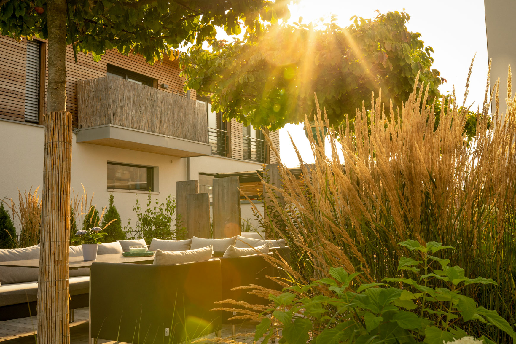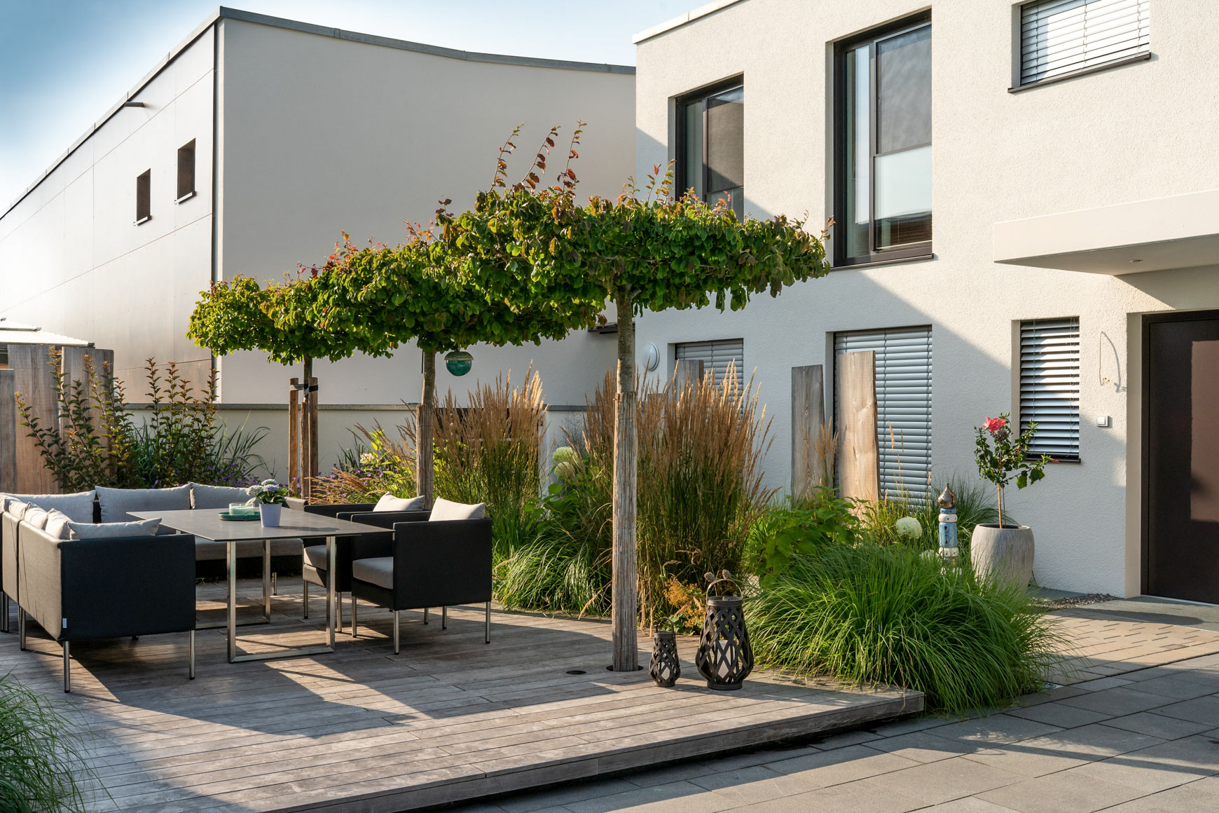 Materalien: Natursteinplatten, Betonpflaster, Holzterrasse, lockere Gräserpflanzung, Sichtschutz aus Baumstammbrettern