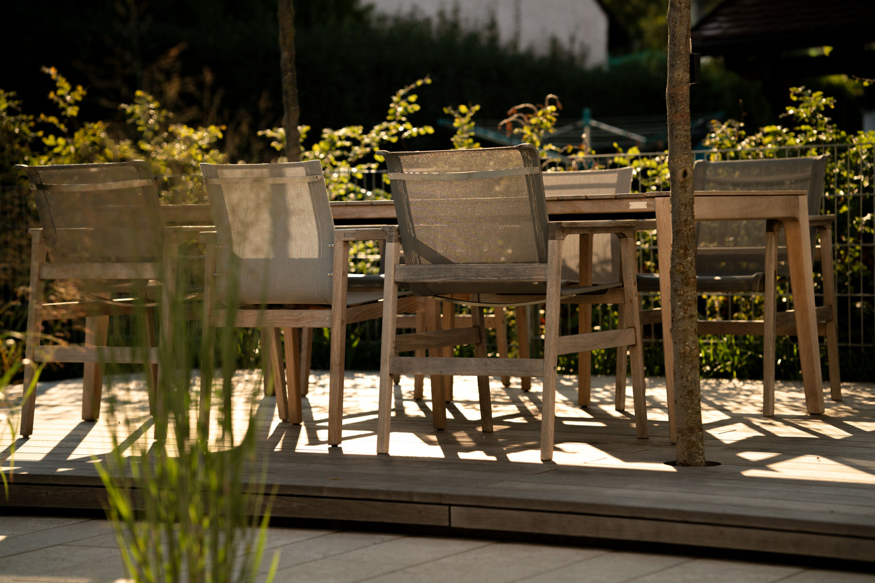 Materialien: Groß- und kleinformatige Natursteinplatten, Holzdeck, Sitzbereich wird von Bäumen überdacht